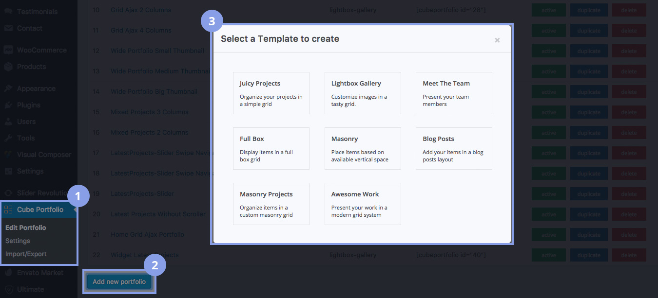 - 1. Open WP Bakery Page Builder plugin from inside any page you are creating, and select Cube Portfolio shortcode.