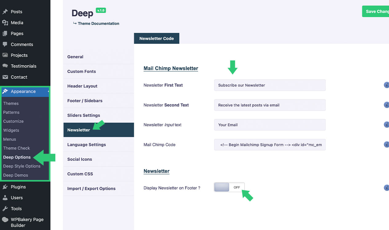 Deep comes with a very powerful options panel. After the theme is installed you can access the options panel by logging into the Wordpress dashboard and clicking Deep Options. Go to menu Appearance -> Deep Options and discover it!