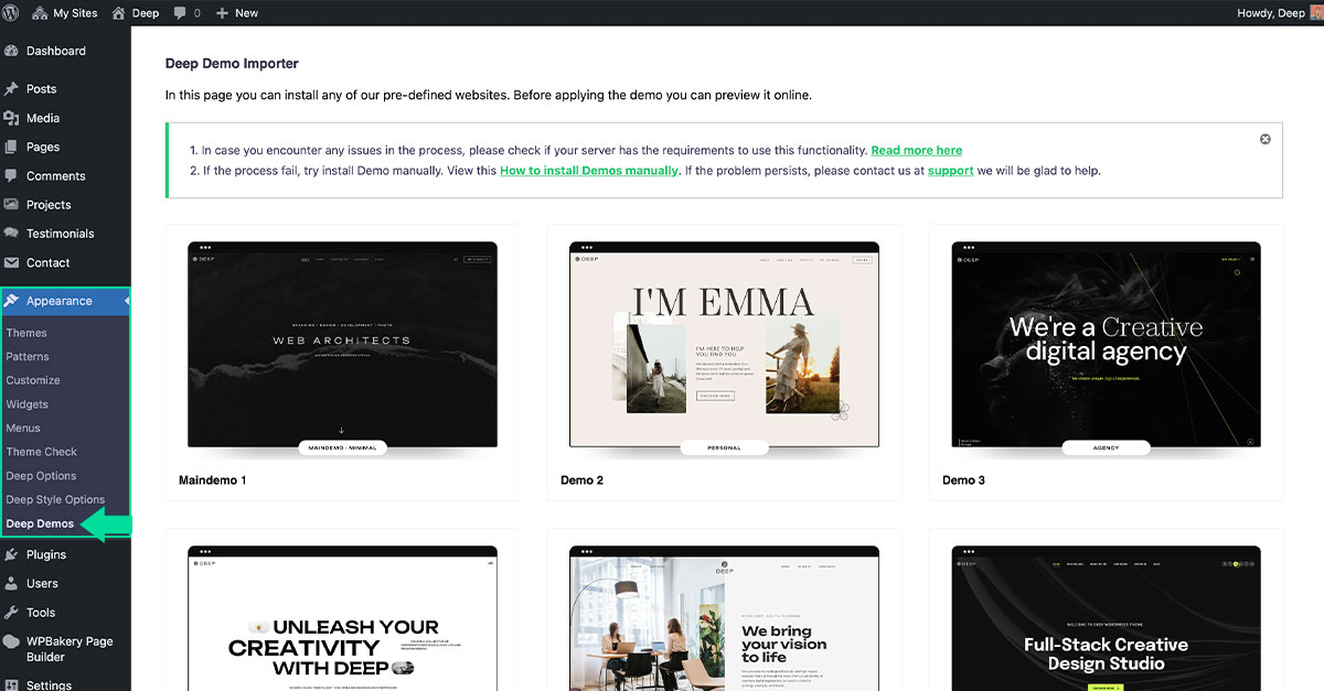 - Choose your Demo from the folder Demo Contents -> 100+ Deep Demos Light & Dark
