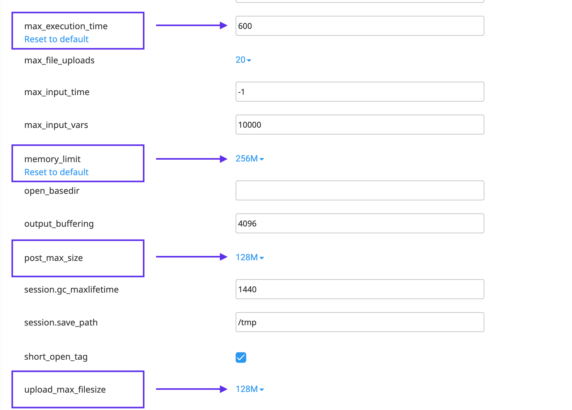 max_execution_time = 600 memory_limit = 264M post_max_size = 128M upload_max_filesize = 128M